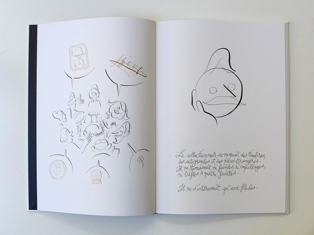 Le collectionneur dont il est question dans ce livre, n'a pour passion ni les timbres, ni les pièces, ni même les trèfles à quatre feuilles. Non, ce qui l'intéresse et ce à quoi il consacre sa vie, ce sont les flèches. Pas n'importe quelles flèches : celles qui indiquent la droite. De l'autre côté de la rue, son voisin trouve cette manie ridicule, pour la bonne raison qu'il est lui-même collectionneur de flèches, mais celles qu'il affectionne montrent la gauche. Lorsqu'un jour, dans une brocante, les hommes se trouvent nez à nez, tous deux sont alors persuadés que la flèche extraordinaire qui se trouve à leurs pieds leur revient de droit, car, bien entendu, selon le côté où l'on se trouve, celle-ci marque la droite... ou la gauche. Les deux collectionneurs n'ont d'autre choix que de partager leur trouvaille et de devenir ami...